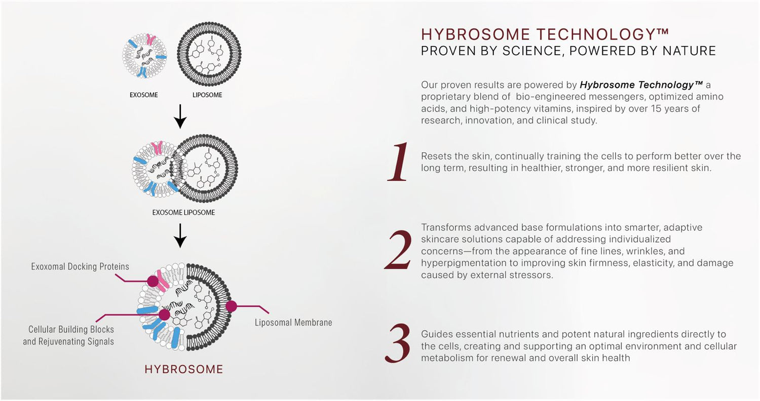 Our patented Hybrosome™ Technology combines young exosomes with liposomes loaded with essential nutrients and powerful natural ingredients to enhance skin regeneration. This advanced approach creates Hybrosomes™— bio-engineered exosomes designed to deliver superior performance.